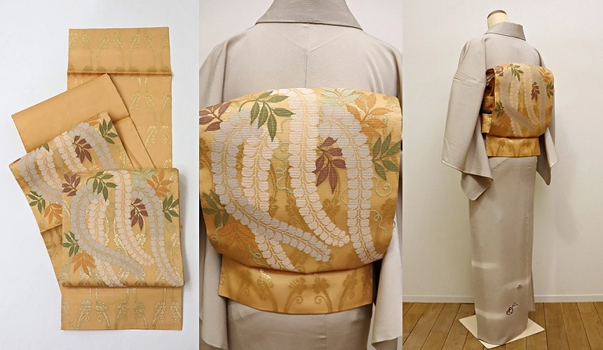 最长!袋带宽约31公分,长度有4公尺20公分。表面的花色比起丸带略为简化,不过织法繁复而且大量使用金、银色系织线,相当高贵华美;而内侧则是素色。是访问着的必备腰带。