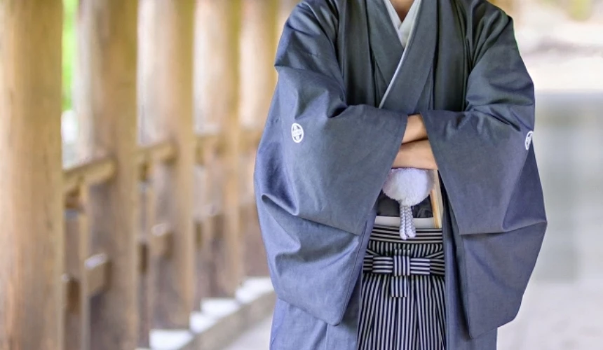 就像女性的「黑留袖」、「色留袖」,男士的礼服也分「黒纹付羽织袴」与「色纹付羽织袴」,由「羽织」(外套)、「长着」和「袴」构成的一整套礼服。黒纹付羽织袴是印有家纹的第一礼服,除了是新郎的结婚礼服,也是日本男性参加晚宴、典礼(例如诺贝尔颁奖典礼)时的正式服装。而色纹付羽织袴则是非黑色的单色服饰,属于一般礼服。