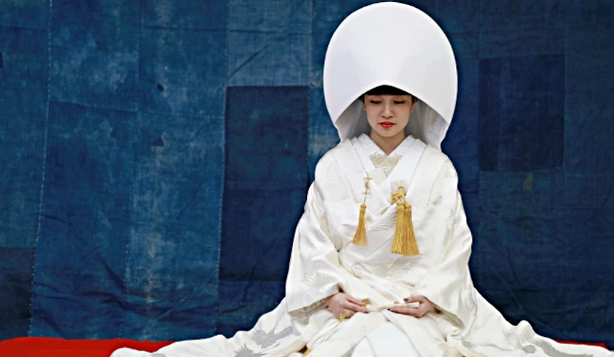 传统上日本新娘的头饰也以白色为主,常见的有两款,包括以帽状盖住发簪的「绵帽子」和环状围在头上的「角隐」。