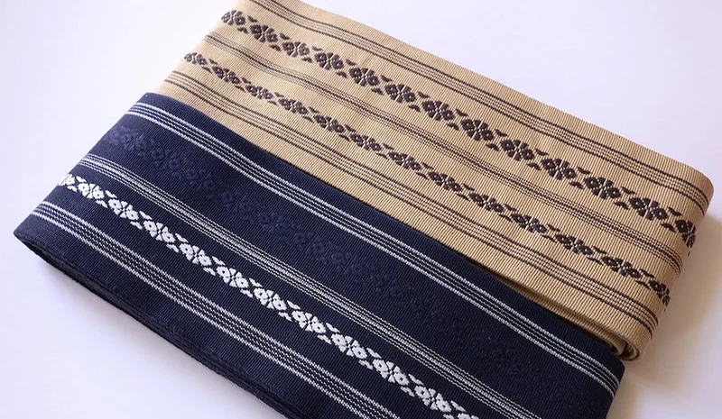 角带是男性和服中最常见也最重要的腰带款式,无论是正式场合或日常外出都能使用。其中以福冈的「博多织」和京都的「西阵织」最为着名。是高品质的象征。正式场合宜选择黑色、深灰、深蓝等素色或细致暗纹款式,日常则可选择藏青、深棕或白底蓝纹的博多织献上柄,展现沉稳又不失个性的风格。