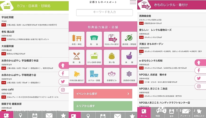 租一套和服或浴衣,加上发型设计,整套下来大约5000日元(未税)跑不掉。这里要告诉大家一个超好用的app:「和服护照」(每京都きものパスポート),也就是当你换上和服或浴衣,到这些配合护照活动的店铺或设施参观、购物、吃饭、进行茶道体验等活动时,结帐时出示手机画面即能享有折扣优惠或是获得特别的小礼物!
