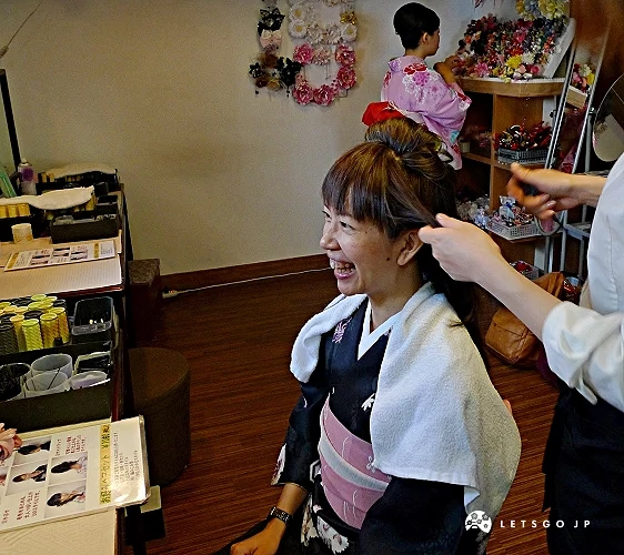 冈本和服提供大约1000件的和服供大家选择,古典风、可爱风都有,适合各种年龄层。冈本备受好评的还有发型设计,工作人员的技艺熟练精巧,收费却只要550日元,而且这么多年来一直没涨价,是京都的和服出租店中最便宜的。