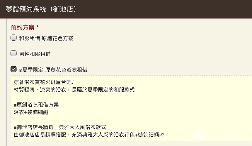 看到这里,是不是很心动了呢?当你决定了日本关西之旅的行程后,建议先上网预约。各家虽然略有不同,但一般来说都可以预约从现在起到未来二、三个月内的日期。本文介绍的三家出租店的官网都有中文介面,一目了然,步骤也超简单的,大约5分钟之内就可完成。以下就以记者亲自体验过的梦馆「御池别邸店」的预约流程做说明。