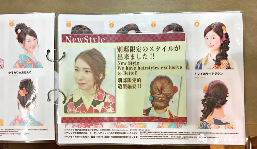 近年来梦馆开设了分店「御池别邸」,位在京都国际漫画博物馆附近。与五条本店大不同,御池别邸是正统的京町家风情,挑选、着装过程一整个舒服。此外,在基本款的8选1发型设计上也多了「别邸限定」共9种选择。
