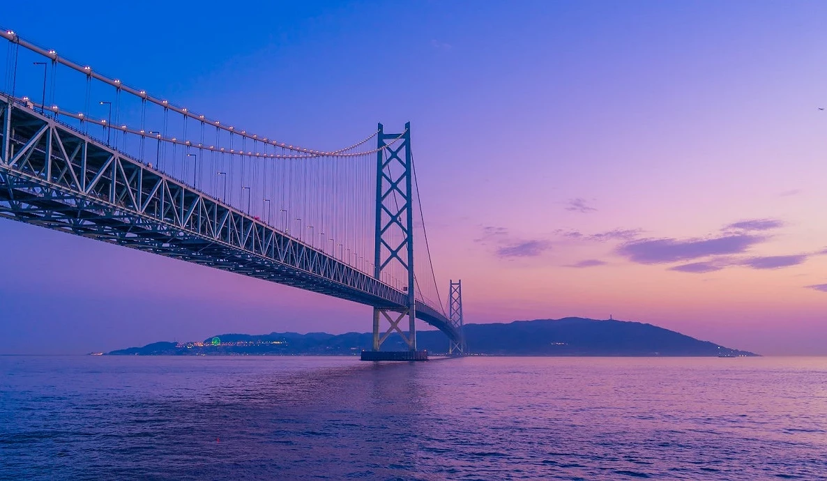 进入淡路岛之前,就是令人兴奋的景点「明石海峡大桥」,为兵库县神户市与淡路岛之间、跨越明石海峡,全长 3,911 公尺,为世界第二长主跨的道路专用吊桥;主塔约 300 公尺,夜间有多样点灯模式。就如同其别名「珍珠桥(パールブリッジ)」一样,晚间的桥上点灯模式多达28种,就像一串珍珠般。整点可见彩虹色的点灯,可谓倒映于海上的梦幻桥梁。